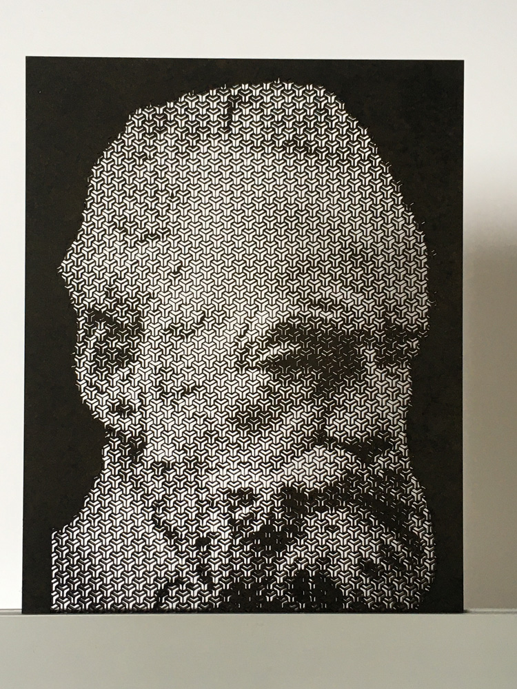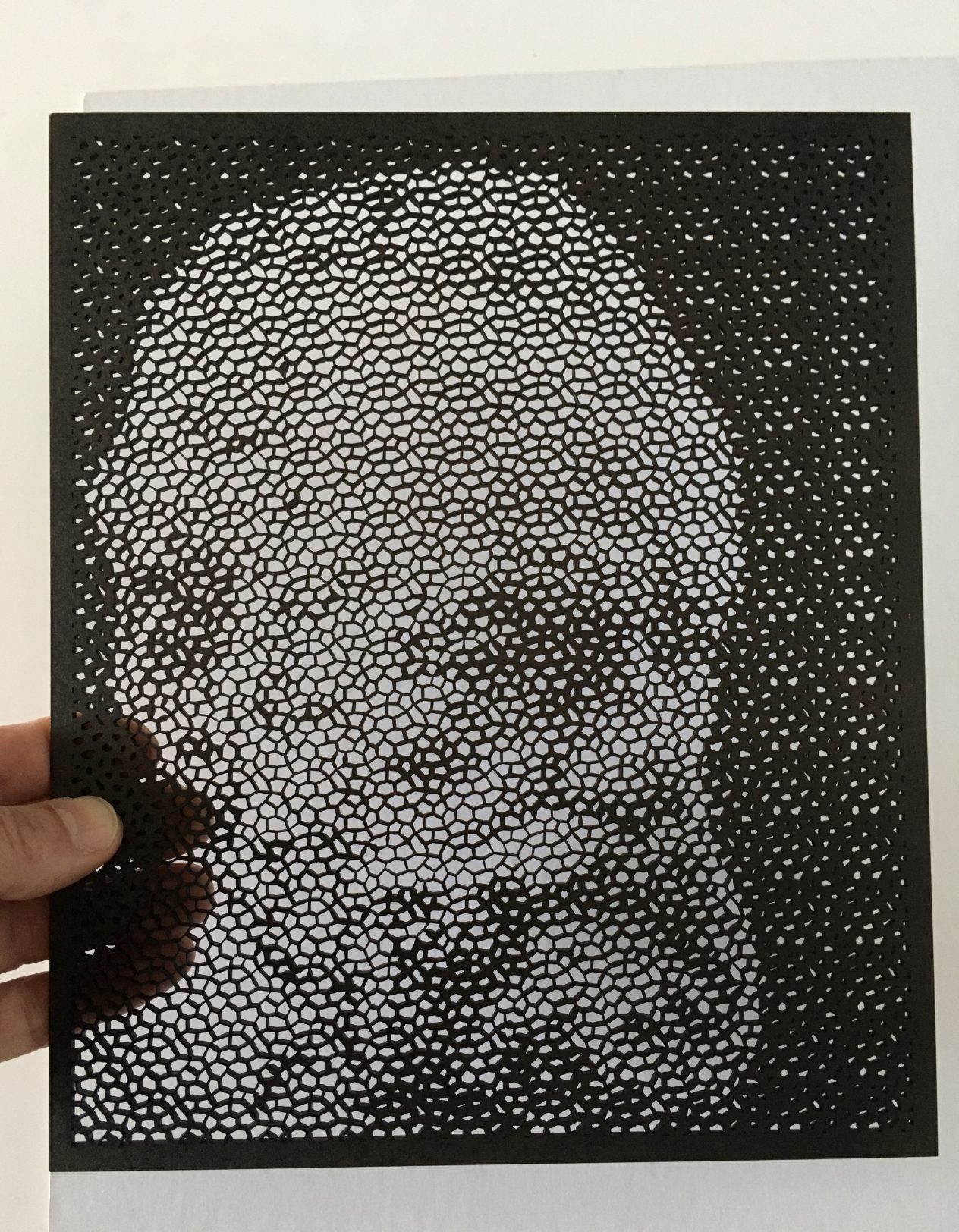 Images en niveaux de gris tramées avec des motifs étudiés afin de permettre la découpe laser sans trouer le support dans les zones où l’image est très lumineuse.